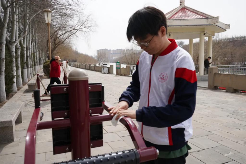 他们认真地擦拭着每一台健身器材,不放过任何一个角落。在清洁过程中,同学们还为前来健身的居民讲解了健身器材使用方法及注意事项,并宣讲了一些健康生活的小贴士。