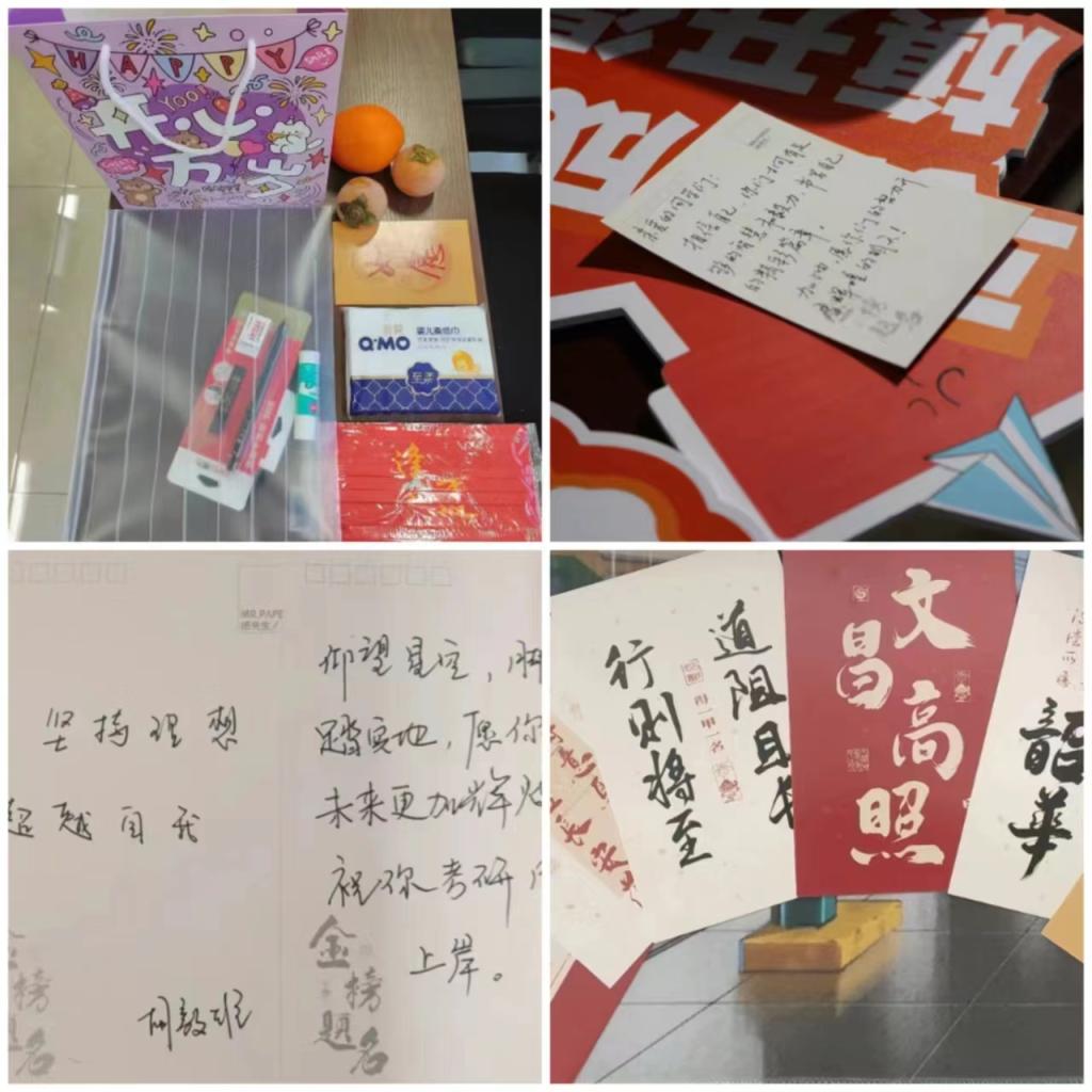 随后,老师们为大家赠送精心准备的考研礼包,包含考试用具、纸巾、逢考必胜的定制口罩、领导老师们精心写下的祝福贺卡、寓意“心想事成”的柿子和橙子,寄托着学院对考研学生的满满心意和温暖祝福。