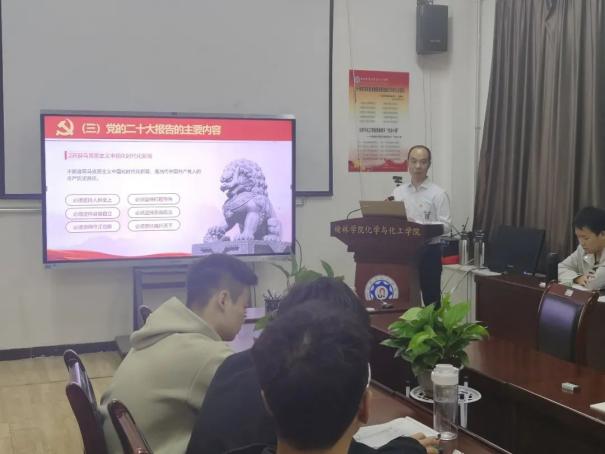 10月16日,化学与化工学院党总支书记陈小辉以“学习贯彻党的二十大精神,争做新时代好青年”为主题,系统讲授了党的二十大召开背景、整体框架、主要内容以及新时代加快建设教育强国的重大战略意义。他号召大家作为新时代青年,要坚定不移听党话、跟党走,有理想、敢担当、能吃苦、肯奋斗,积极投身社会主义现代化建设。