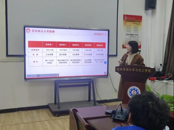 10月17日,化学与化工学院党总支副书记张迪以“认真学习新党章,做新时代合格共产党员”为题,就党的二十大修改党章的必要性、主要特点、修订内容进行全面解读,呼吁大家主动学习党章内容、领悟内涵实质,通过党章学习,明晰如何在新时代做一名合格的共产党员。