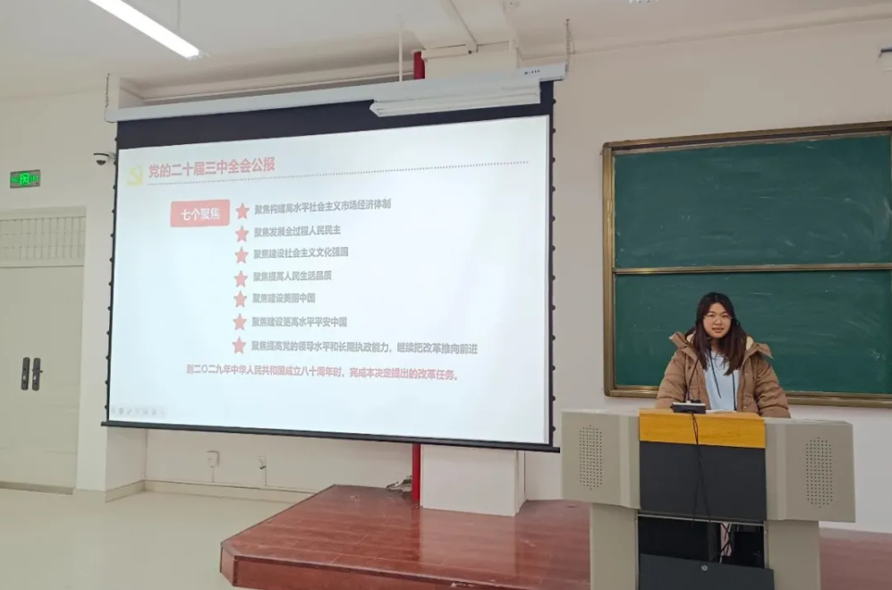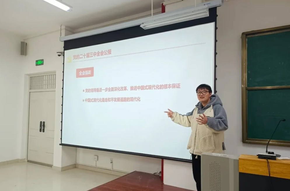 12月16日中午,宣讲人员韩慧哲和高秀明分别走进12号公寓楼一站式社区510和506宿舍,韩慧哲为同学们解读了中国共产党第二十届中央委员会第三次全体会议公报,从全面深化改革的原则,教育科技人才的重要性等方面进行阐述,帮助大家把握全会精神,认识到进一步全面深化改革对于推进中国式现代化的重大意义。高秀明讲解了习近平总书记在全国教育大会上的重要讲话,强调了用新时代中国特色社会主义思想铸魂育人的重要性,旨在提升我国教育的国际影响力、竞争力和话语权,明确了建成教育强国的战略目标和立德树人的根本任务,她的报告让同学们对习近平总书记的讲话精神有了更深刻的理解和认识。两位宣讲员的精彩讲解,激励同学们积极投身学习,为实现中华民族伟大复兴的中国梦贡献青春力量。