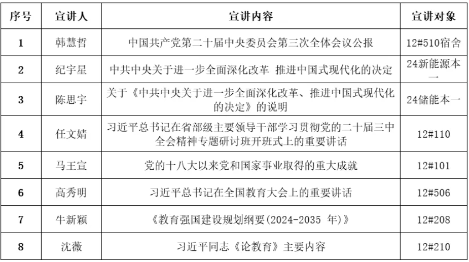 为深入学习贯彻党的二十届三中全会暨全国教育大会精神,领会习近平总书记关于全面深化改革的一系列新思想、新观点、新论断,自12月4日起至12月16日,我院学生党支部及“微光”理论宣讲团联合组织学生党员走进伟德国际victor1946班级及12号公寓楼一站式社区,开展党的二十届三中全会暨全国教育大会精神系列宣讲活动。