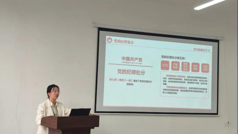 在"重温党章及入党誓词"环节,全体党员庄严肃立,齐声诵读党章总纲节选及入党誓词。代晓敏老师重点剖析党章中党员义务与党的纪律条款,联系学生党员日常学习与生活实际,号召大家“对照党章找差距”,以更高标准践行先锋模范作用。学习过程中,党员们重新审视党员权利与义务,在研讨环节积极分享见解、交流感悟,思想的火花在碰撞中愈发闪亮。这种学习让党章要求不再停留于纸面,而是真正融入思想深处、落实到具体行动。通过此次学习,党员理想信念更加坚定,责任担当意识显著增强,未来将以党章为镜,时刻对照检视,在学习和实践中践行党员使命。