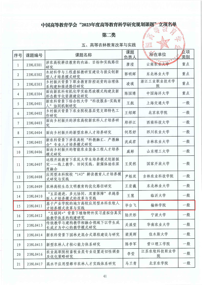 近日,中国高等教育学会公布了“2023年度高等教育科学研究规划课题”立项项目名单,其中由我校生命科学学院毕台飞教授主持申报的《基于产业学院的地方高校应用型本科农牧人才培养模式改革与实践》立项为国家一般课题,这也是生命科学学院今年获批陕西省现代农业产业学院后进行的应用型农牧人才培养模式方面的有益探索与实践。