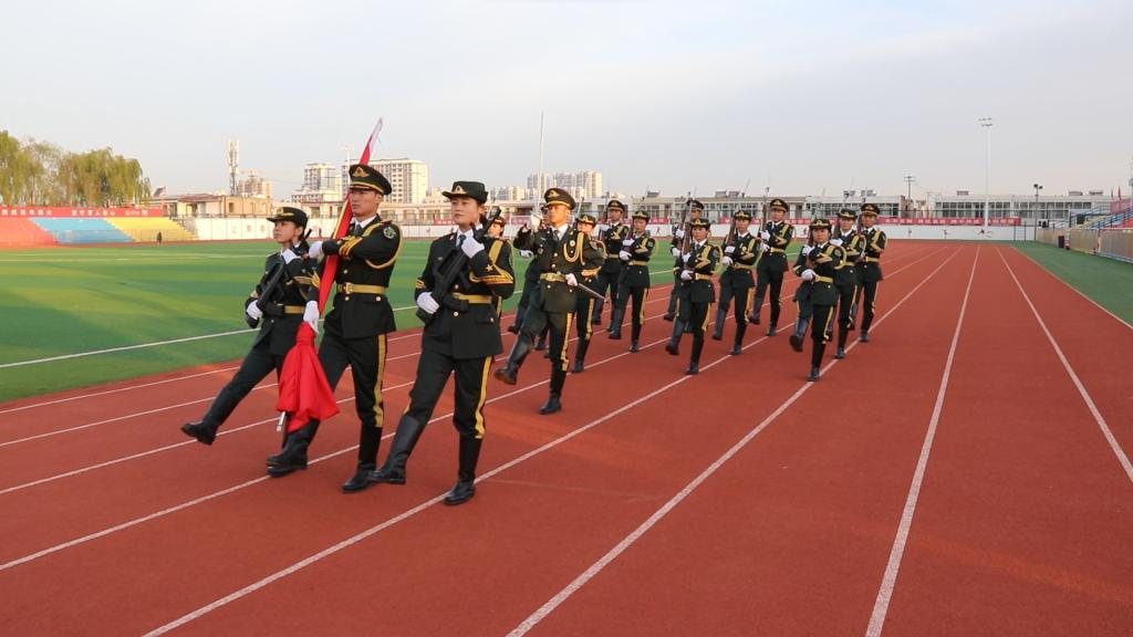 国旗护卫队迈着铿锵有力的步伐,喊着响亮的口号,护送鲜艳的五星红旗走向国旗台,全体师生庄严肃穆行注目礼,高唱国歌,浓浓的爱国氛围伴随着歌声在学院上空久久飘扬。